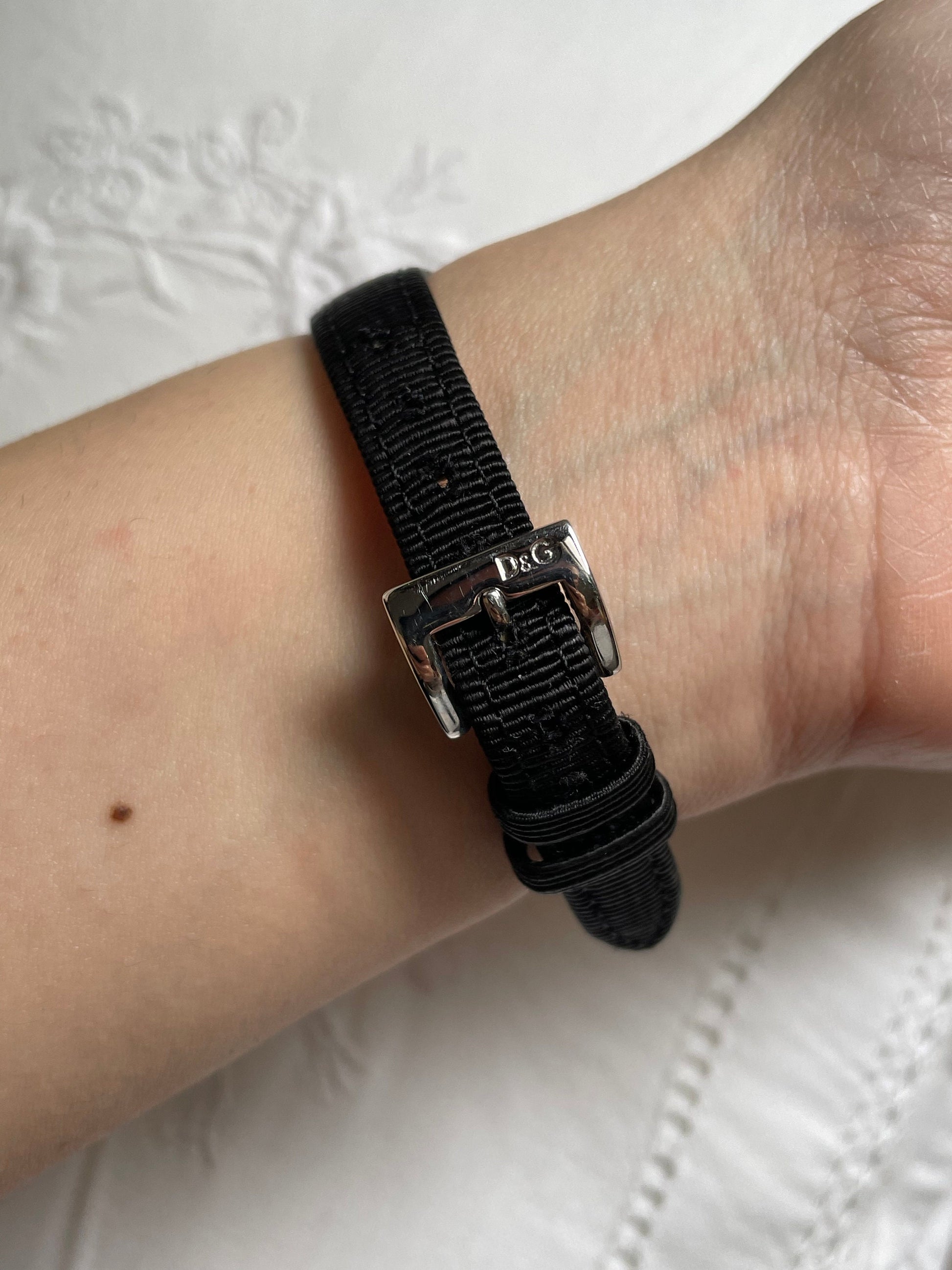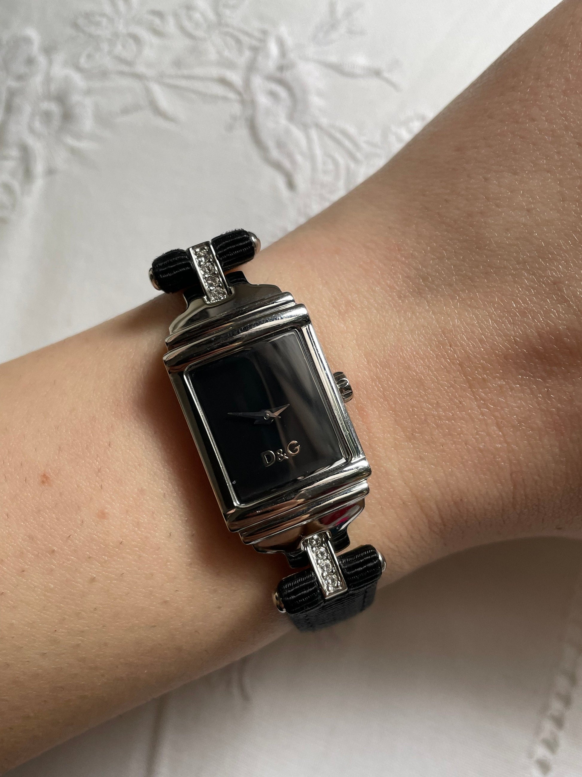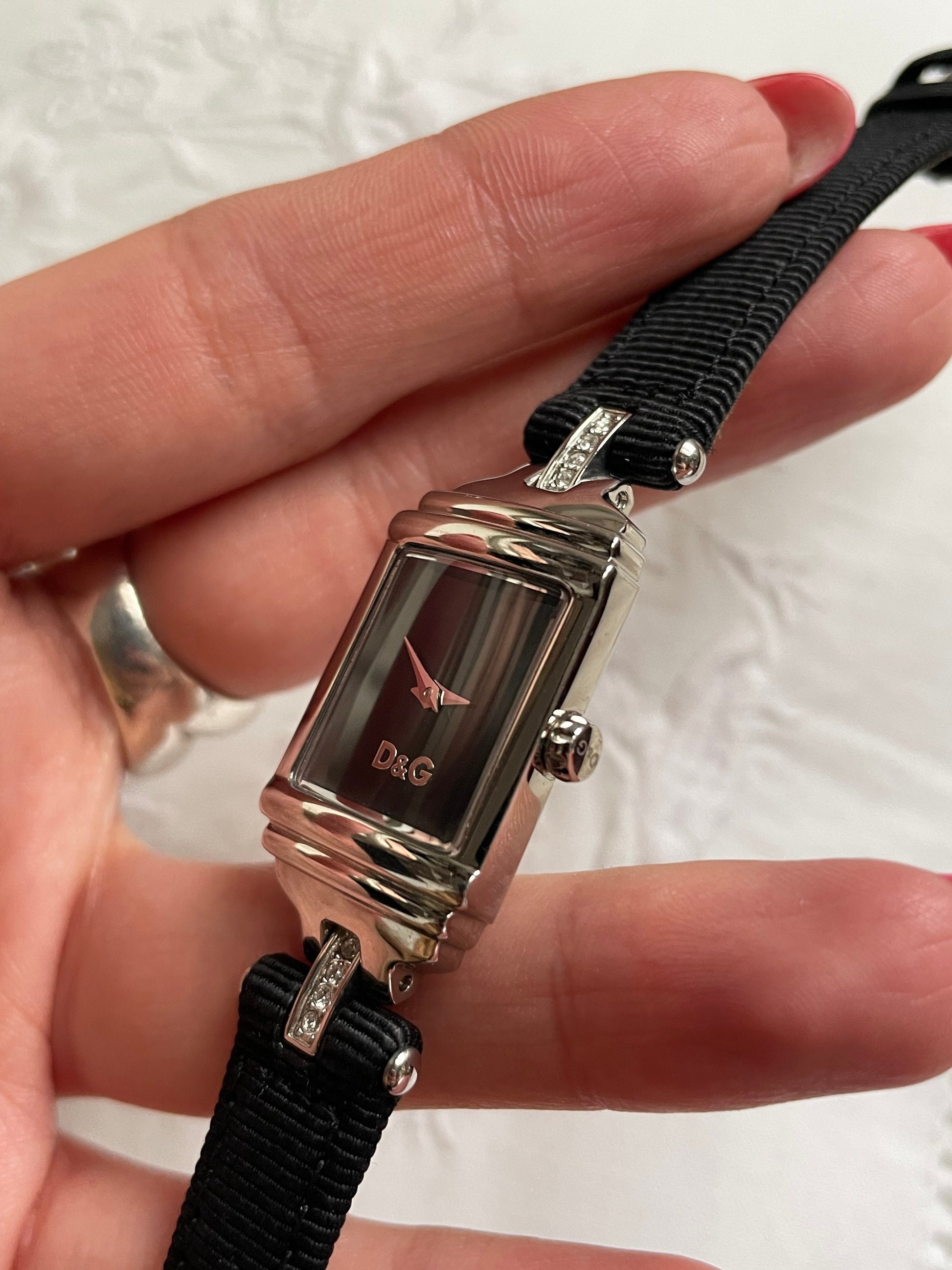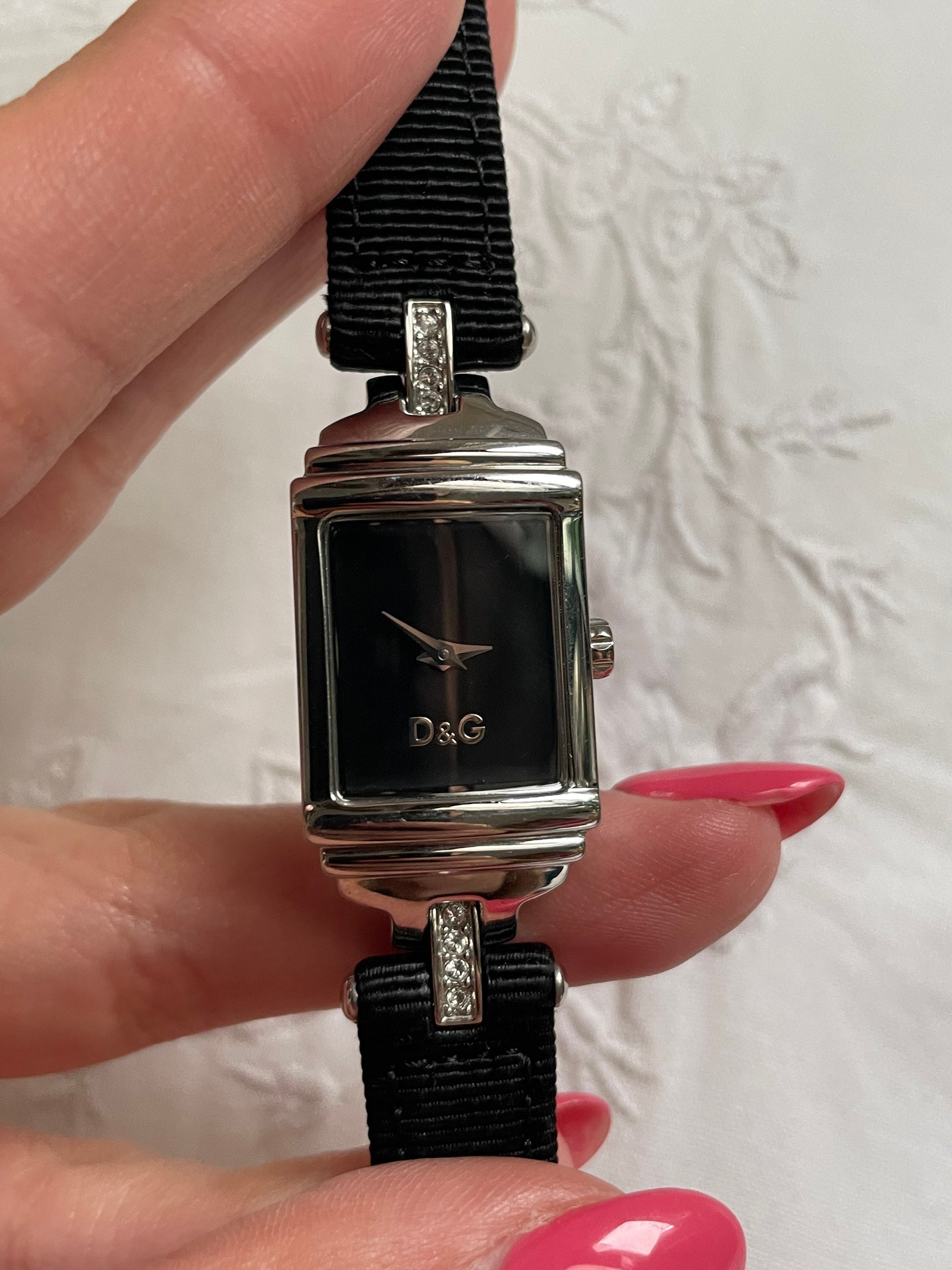 A very elegant authentic D&G Dolce And Gabbana stainless steel watch with black fabric and leather strap, has a very art deco look to with with white stone detail, geometric style. The watch is in fully working condition and looks like it’s almost new or only worn a couple of times.