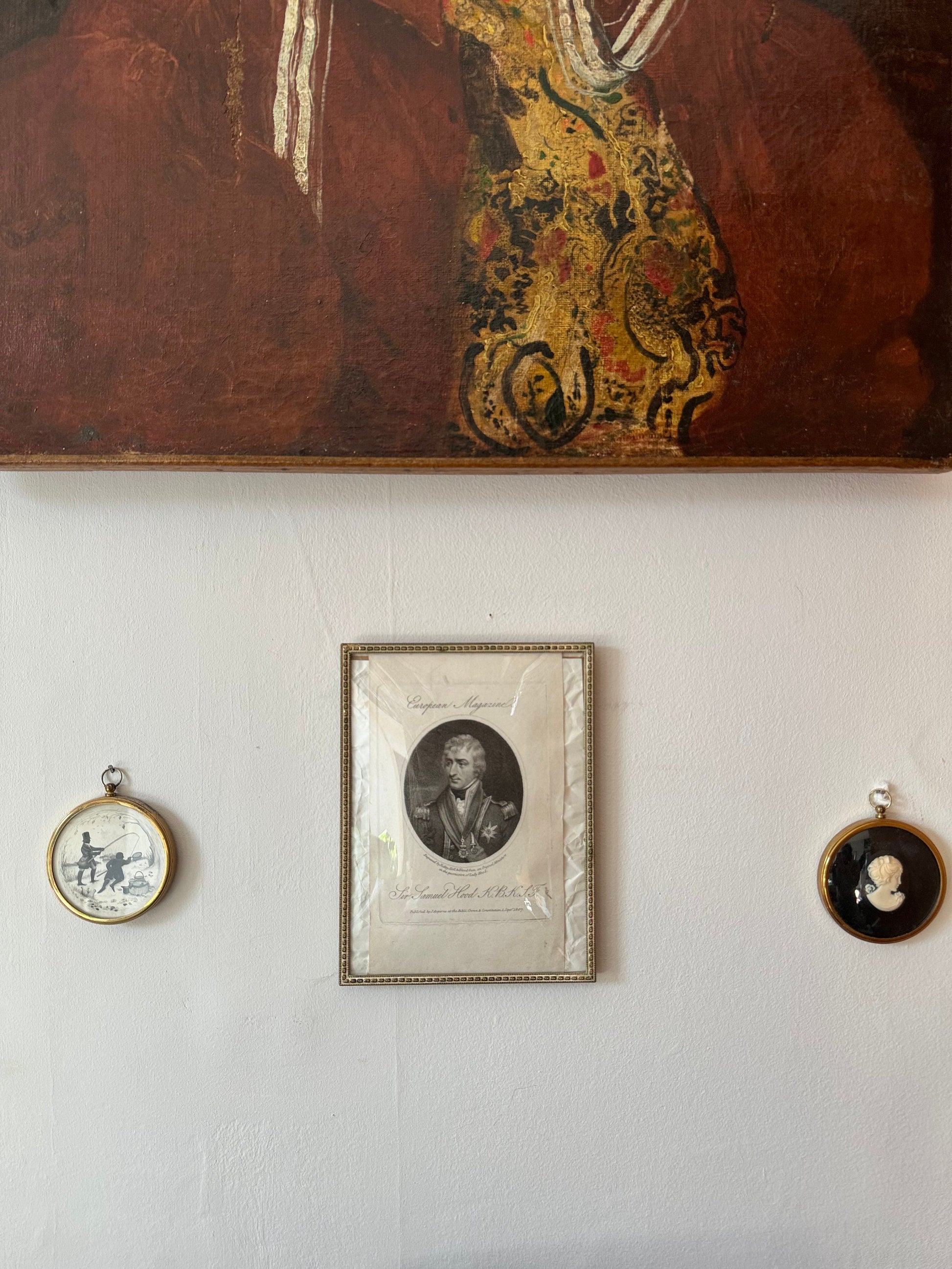 An oval bust-length portrait of Samuel Hood (1762–1814) in captain’s full dress uniform, 1795–1812, with the Nile medal, the ribbon and star of the Order of the Bath and the neck decoration of the Sicilian Order of St Ferdinand and of Merit. Lettered beneath the image with the title, ‘Sir Samuel Hood K.B. K.S.F.’ Also lettered with the publication details: ‘European Magazine / Engraved by Ridley, Holl & Blood from an Original Miniature in the possession of Lady Hood. Published by J. Asperne at the Bible, Crown & Constitution, 1 Septr. 1807’.