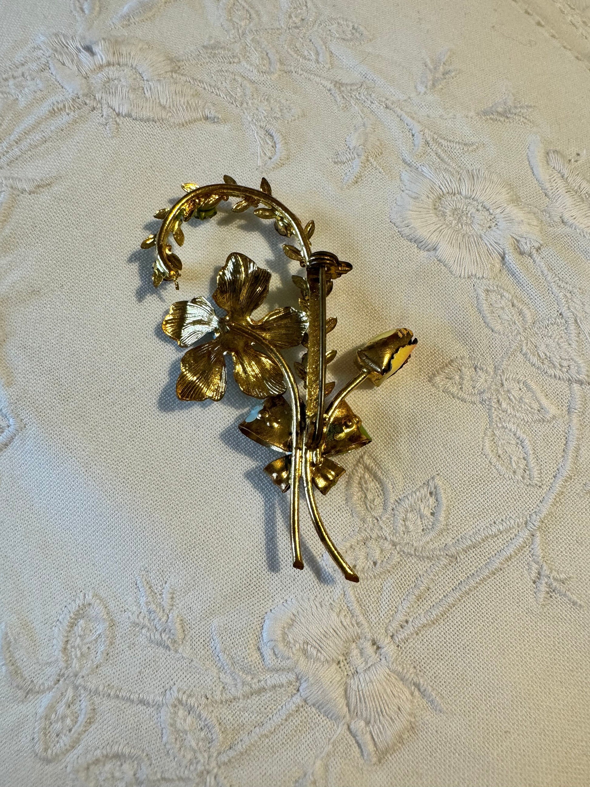 Beautiful and delicate 1930s Enamel Flower and Rhinestone Brooch Pin in a Gold Plated setting. Pastel flowers set bloom to shape the gold tone brooch with enamel flowers and prong set crystal accents. Safety clasp pin back. Measures 6.5cm x 4cm. In good vintage condition with no missing stones.