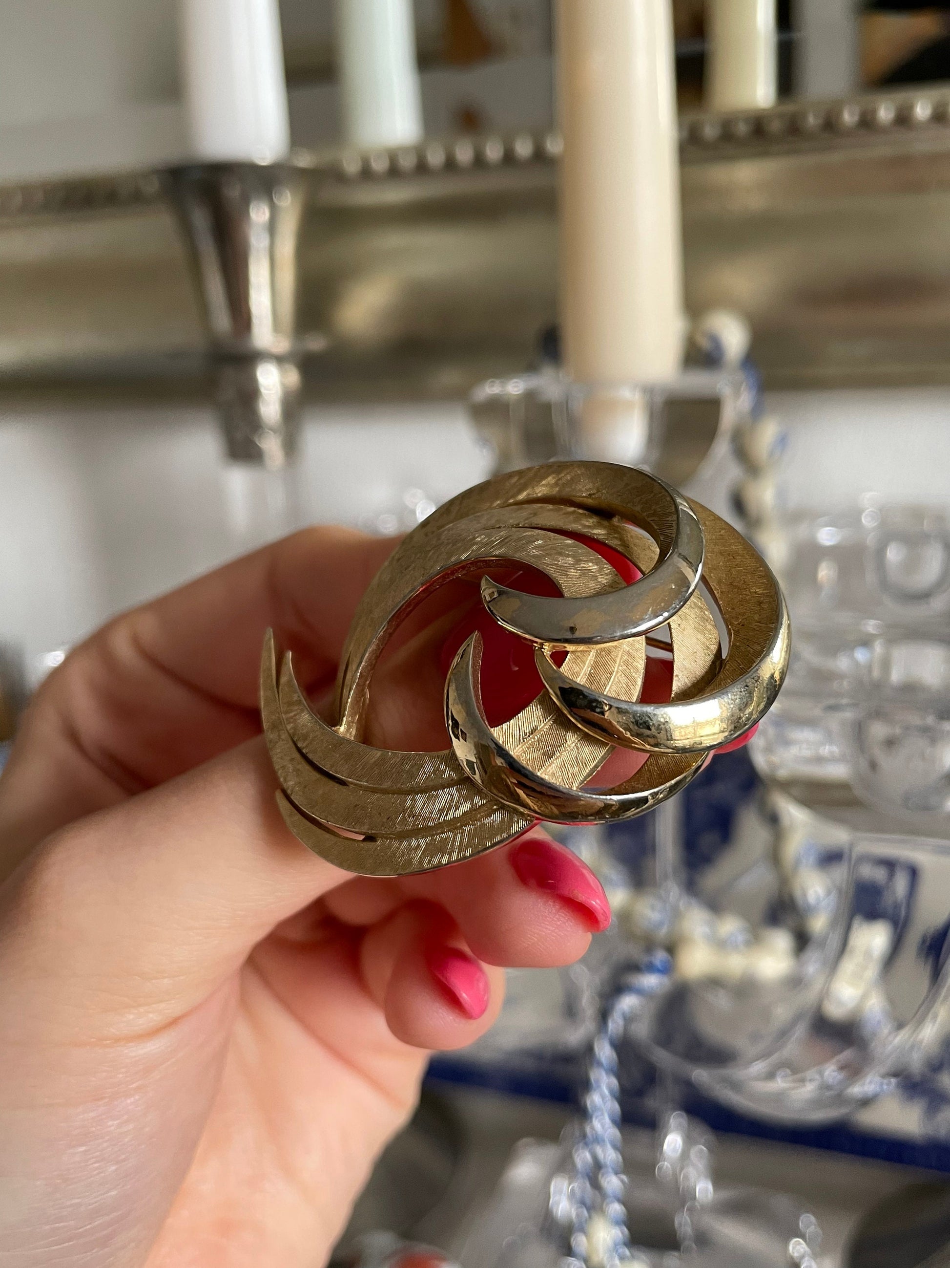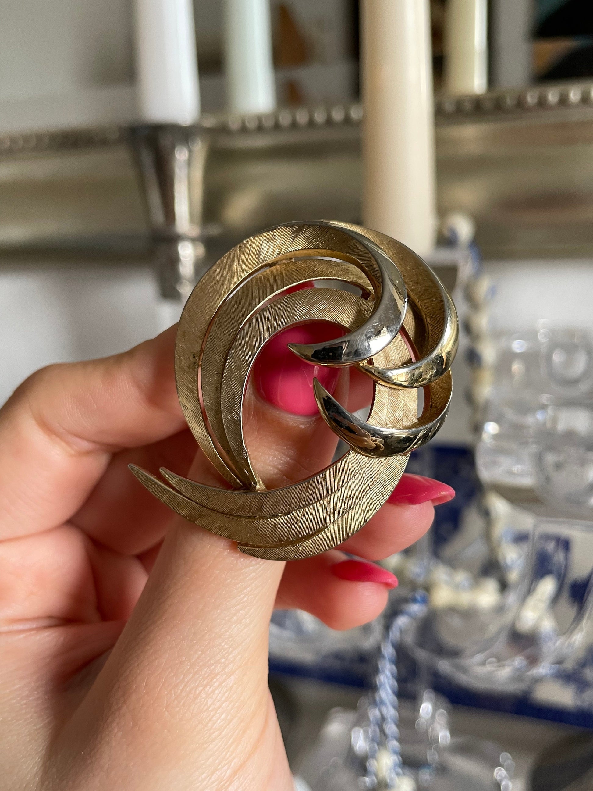 Vintage Crown Trifari Feather Brooch and Earrings Gold Tone, Signed Costume Estate Jewelry. It dates approximately back to the 1955- 1960s. Mid-century piece of wonderful jewellery. Signed Crown Trifari, with the crown over the “T”.