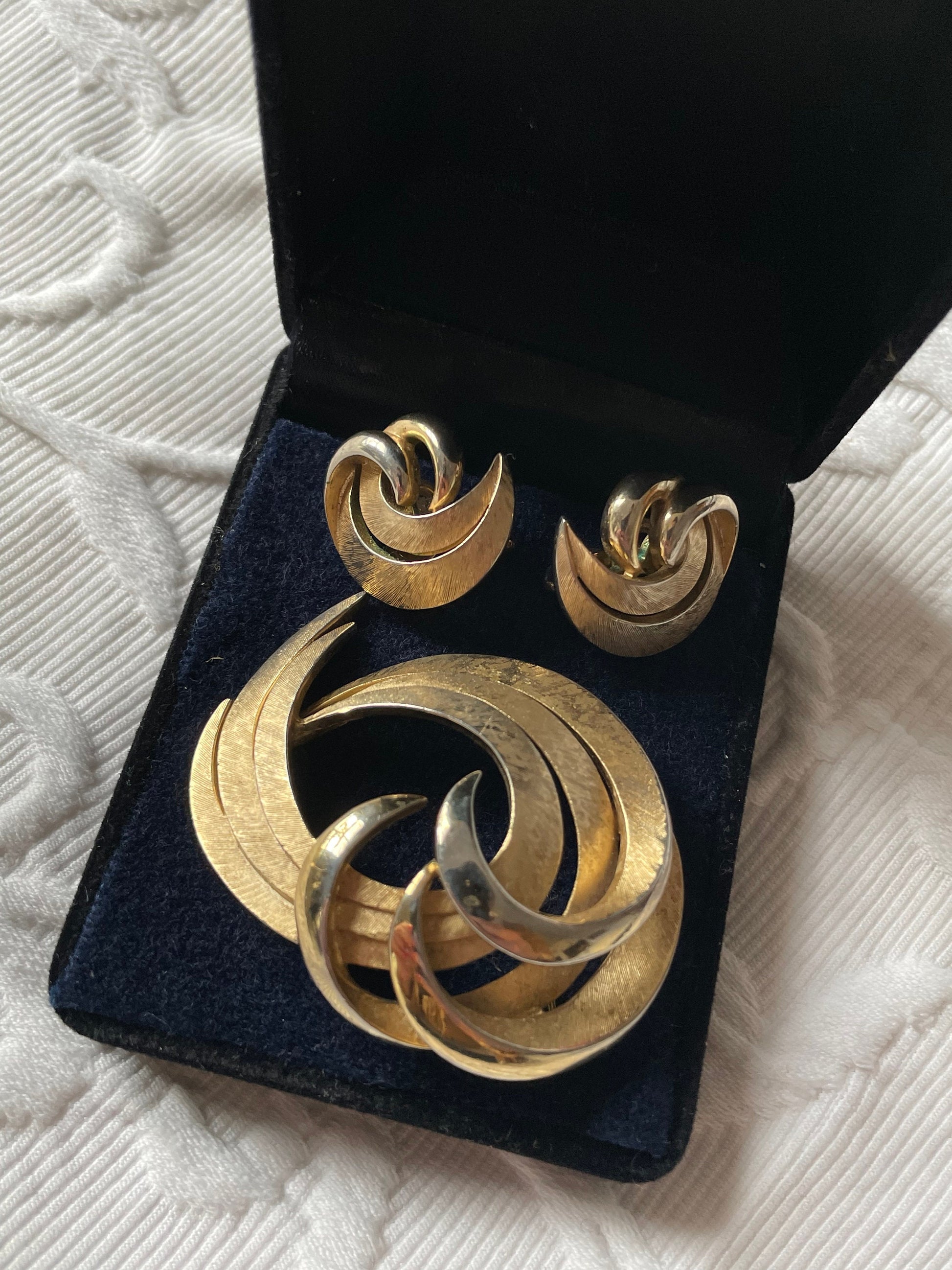 Vintage Crown Trifari Feather Brooch and Earrings Set - Gold Tone 1960s