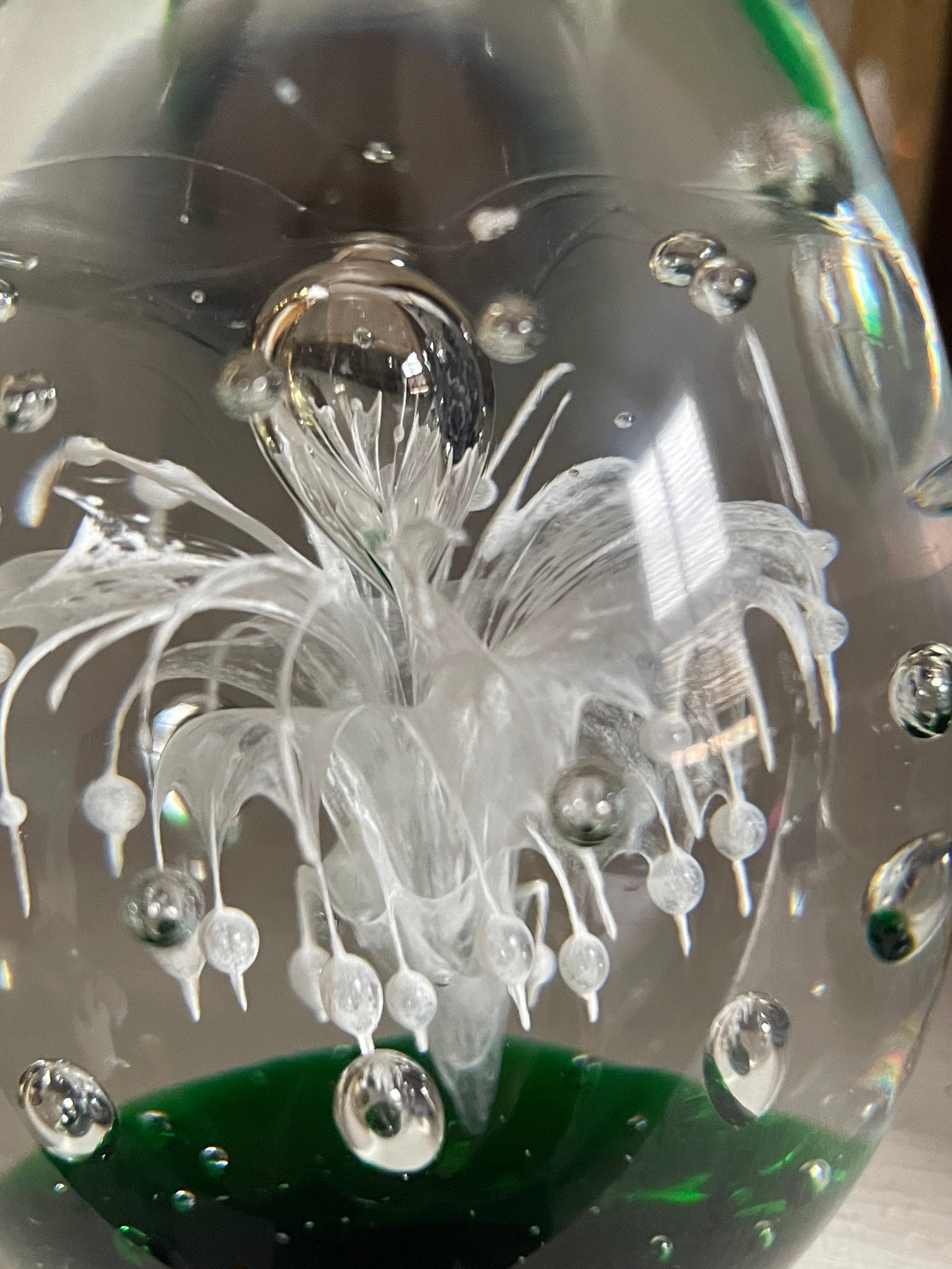 A beautiful oval egg shaped glass paperweight with green base and an interesting design. Very likely this is Italian / Venetian Glass, possibly Murano, But there is no makers mark.